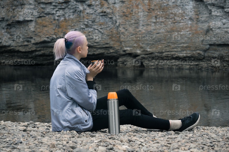 Девочка-подросток-путешественница сидит с кружкой на берегу реки и смотрит на прибрежные скалы