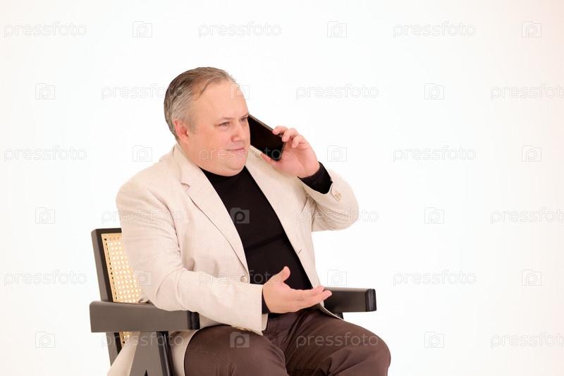Мужчина сидит в кресле и разговаривает по телефону на белом фоне