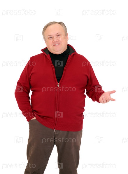 Мужчина разговаривает и жестикулирует в полный рост на белом фоне