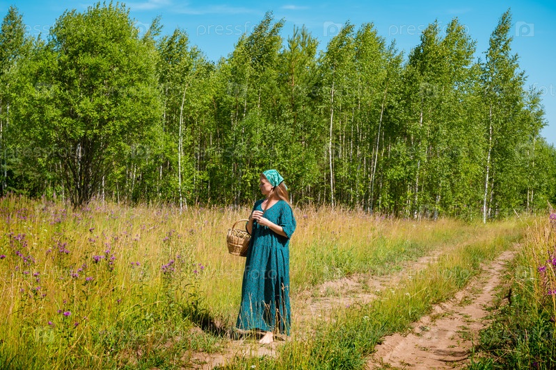Молодая женщина в народной крестьянской одежде с плетеной корзиной идет по полевой дороге