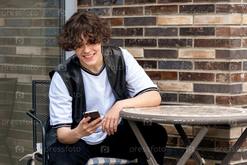 Молодой человек читает смешное сообщение по телефону, сидя за столиком в кафетерии на открытом воздухе