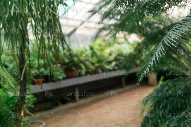 Частично размытый интерьер большой тропической оранжереи с листьями пальмы на переднем плане