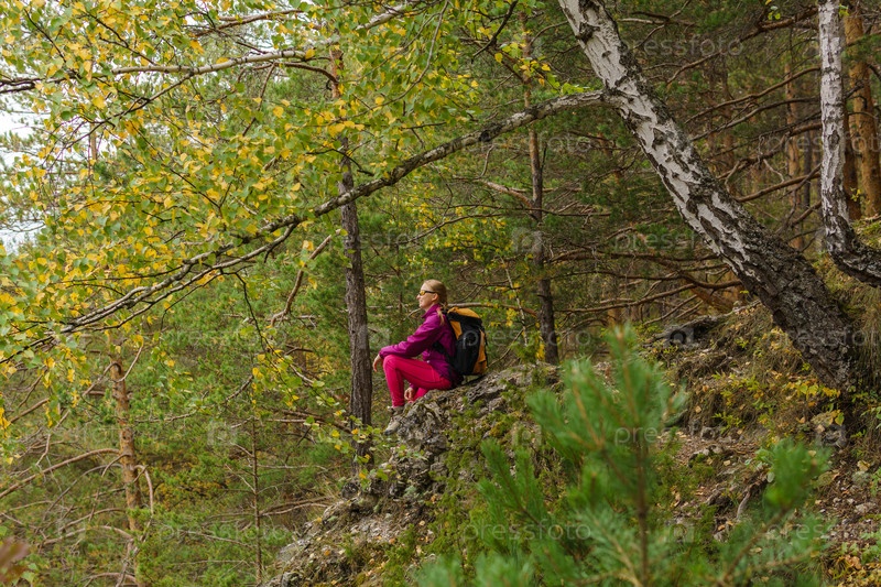 Молодая женщина-путешественница сидит отдыхая на скале среди горного леса