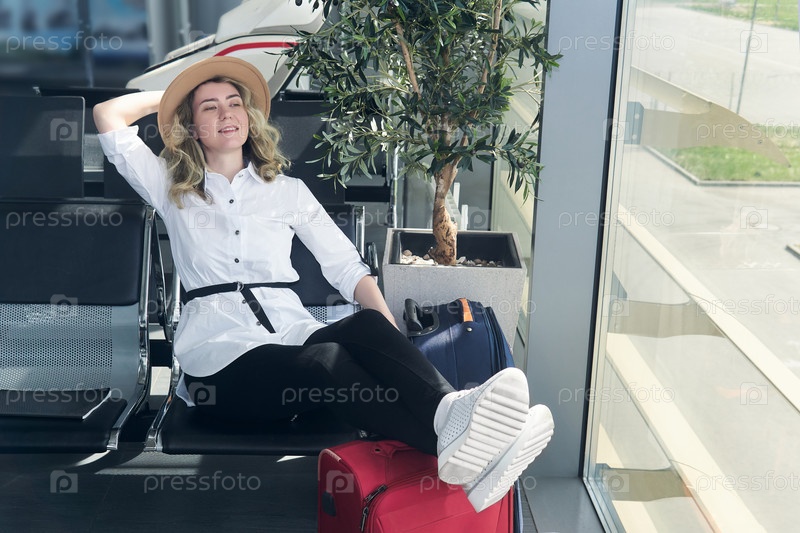 Счастливая женщина-путешественница в зале ожидания ждет посадки
