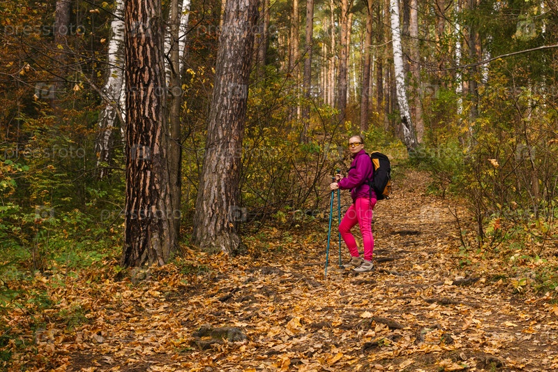 Женщина гуляет по осеннему лесу