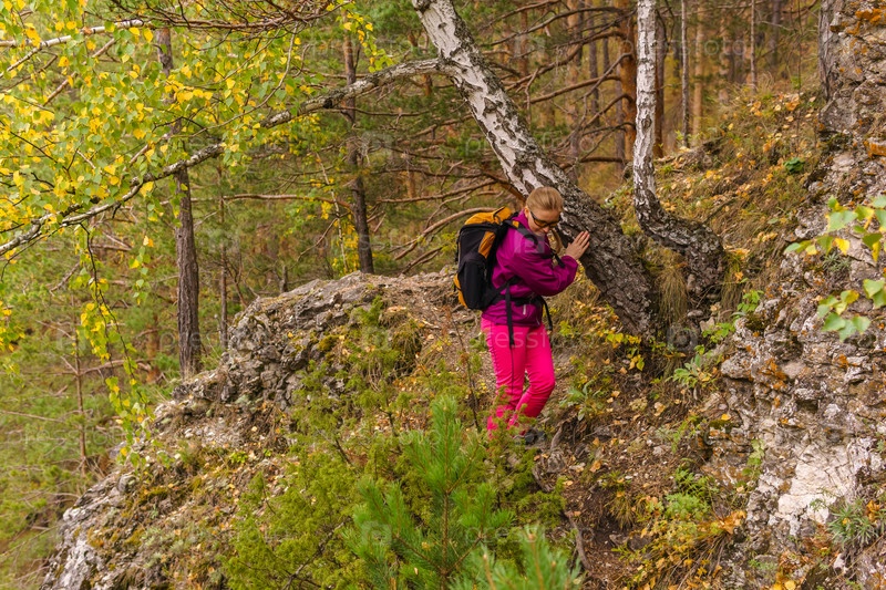 Женщина-путешественница путешествует по осеннему лесу