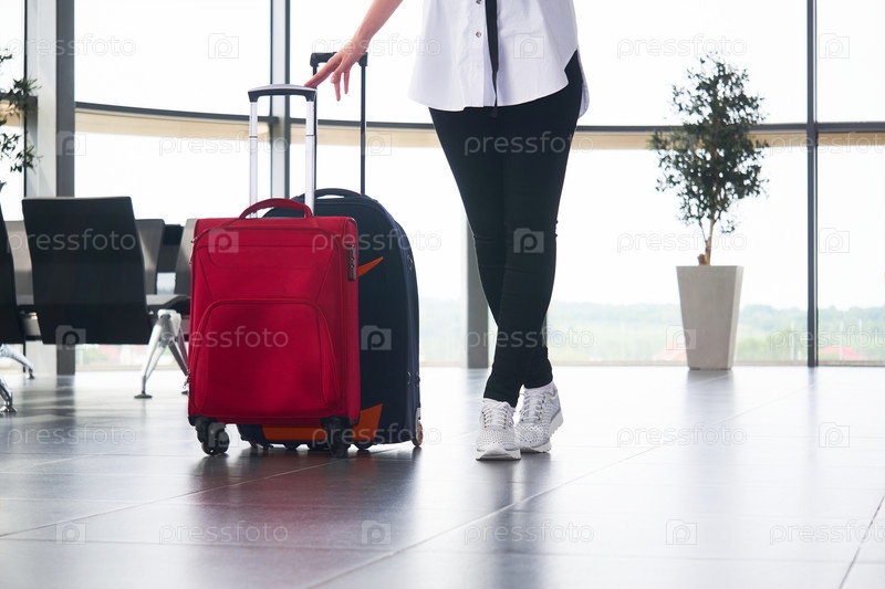 Женщина-путешественница с багажом поднимается по лестнице в зале аэропорта или вокзала; ноги и чемодан крупным планом