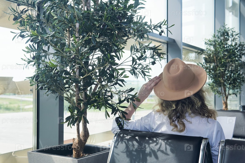 Женщина-путешественница в шляпе сидит в зале ожидания аэропорта, вид сзади