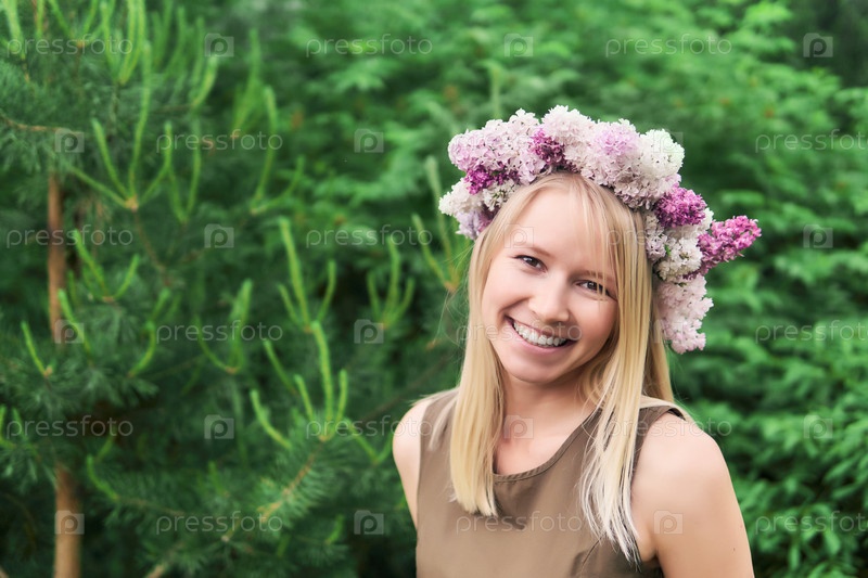 Девушка женщина в цветочном венке из сиреневых цветов на естественном фоне на открытом воздухе