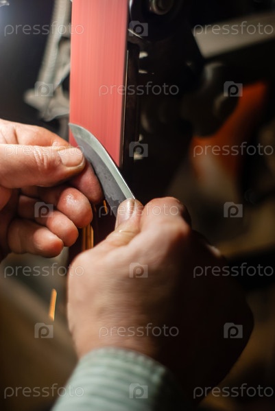 Руки слесаря затачивают заготовку под нож