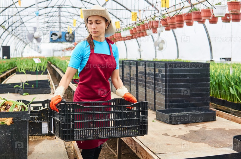 Молодая женщина работает в промышленной цветочной теплице