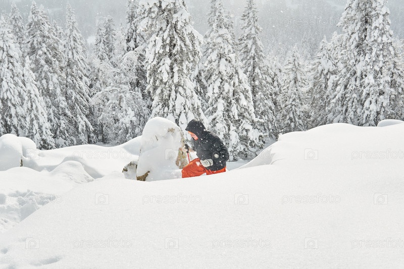 Женщина занимается походом в зимние горы
