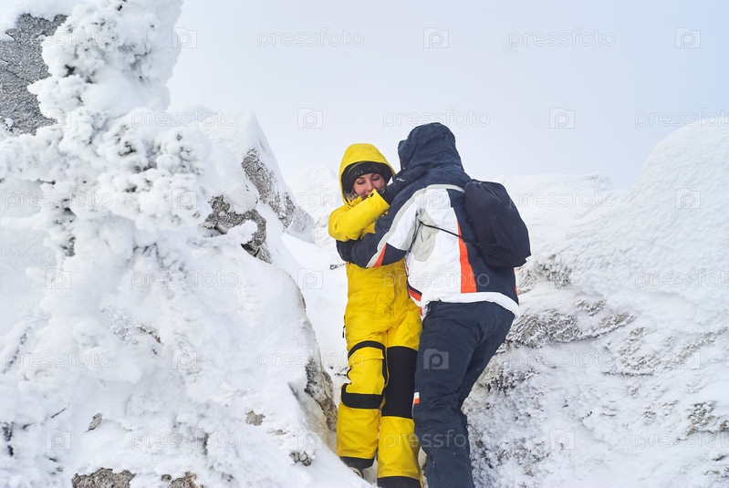 Путешественники мужчина и женщина спускаются со снежной вершины горы