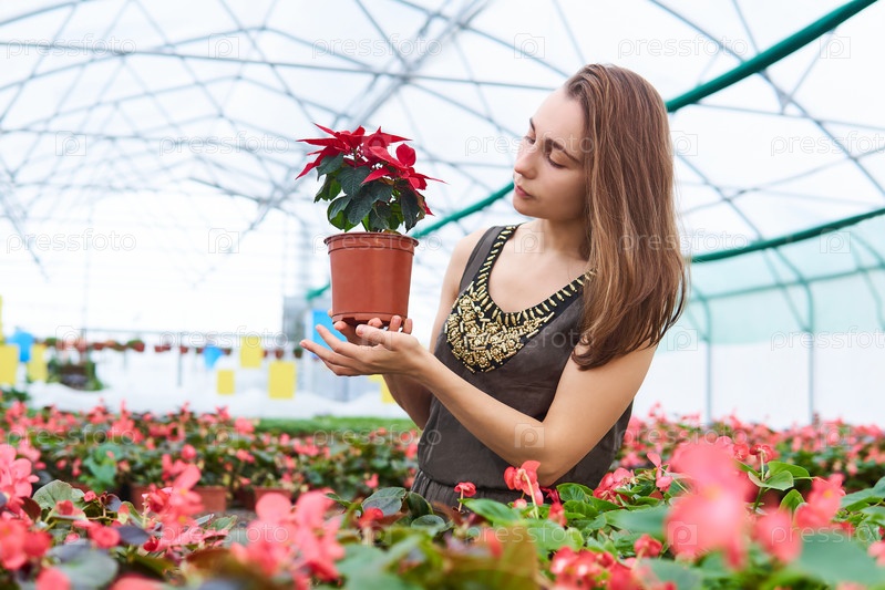 Женщина в теплице держит горшок с пуансеттией