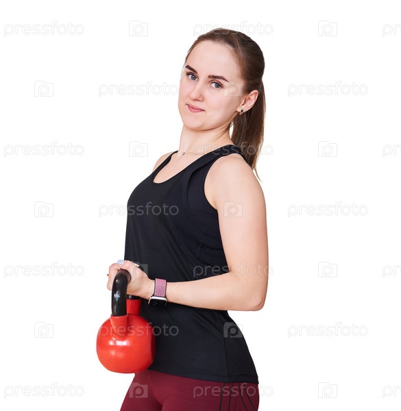 Молодая женщина выполняет упражнение с гирей, изолированной на белом фоне