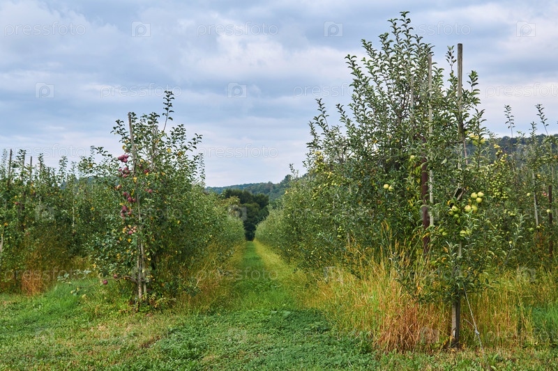 Проход между рядами молодых фруктовых деревьев в яблоневых садах