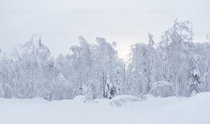 Зимний пейзаж - замерзшие деревья на краю заснеженной поляны