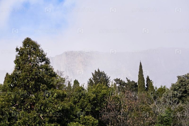 Горный массив в тумане едва виден за деревьями