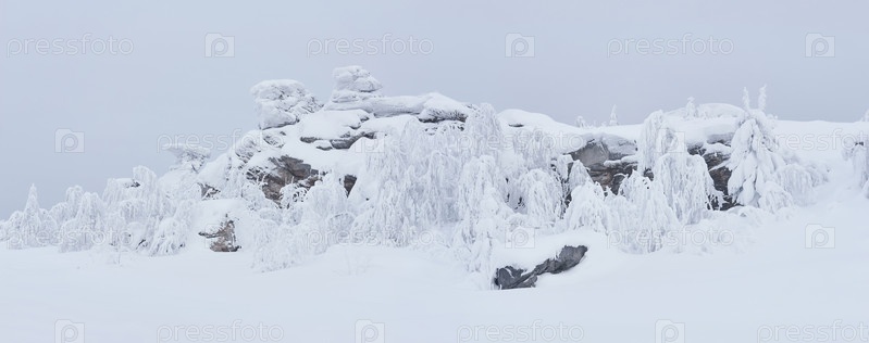Заснеженные скалы и покрытые инеем деревья на горном перевале зимой
