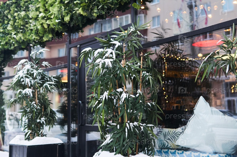 Заснеженный бамбук возле двери уличного кафе