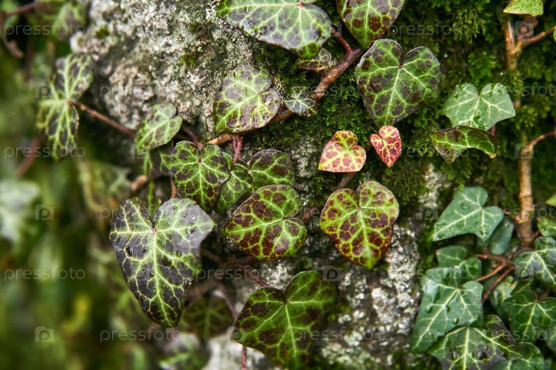 Разноцветные листья плюща, обвивающие мшистый ствол дерева