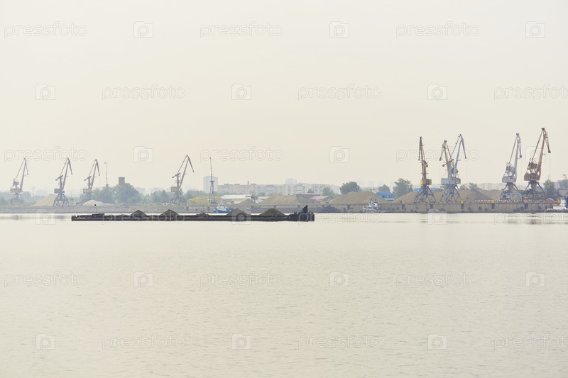 Промышленный речной водный ландшафт с сухогрузной баржей и грузовым терминалом в утреннем тумане