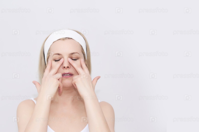 Женщина средних лет делает самомассаж лица вокруг глаз, портрет крупным планом