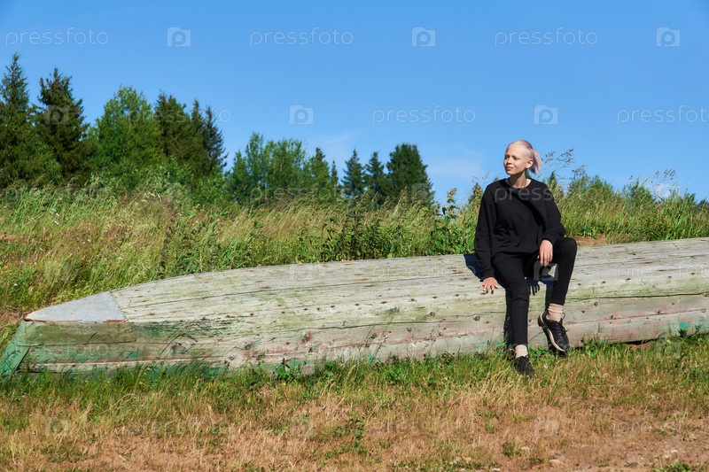 Девочка-подросток сидит на перевернутой лодке на берегу