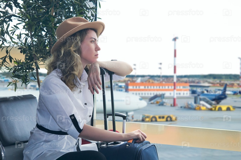 Женщина-туристка в зале аэропорта долго ждет посадки на рейс