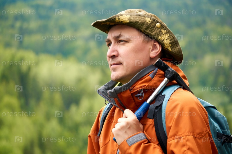 Портрет мужчины-геолога с рюкзаком и геологическим молотком на фоне лесистого горного ландшафта