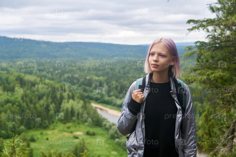 Девочка-подросток с рюкзаком гуляет по вершине горы на фоне лесистых холмов