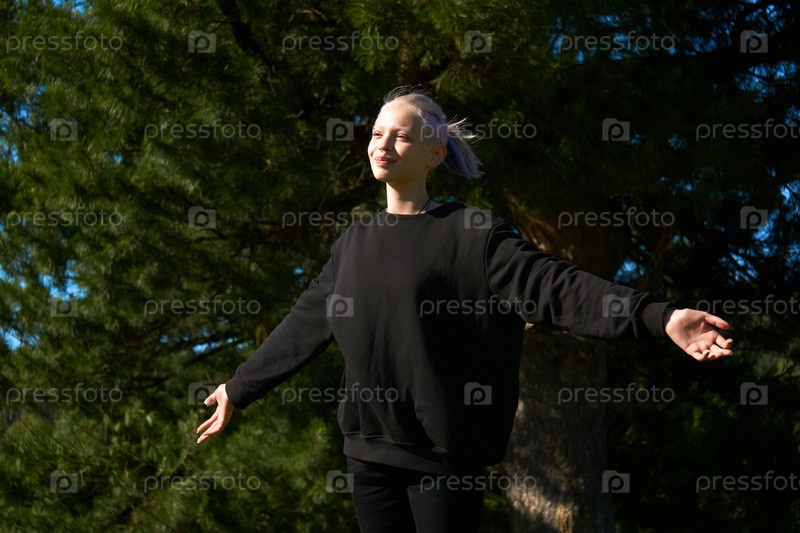 Девушка-подросток радуется солнцу и ветру на фоне большого дерева