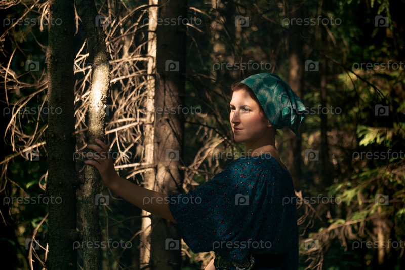 Молодая женщина в традиционной народной крестьянской одежде в хвойном лесу