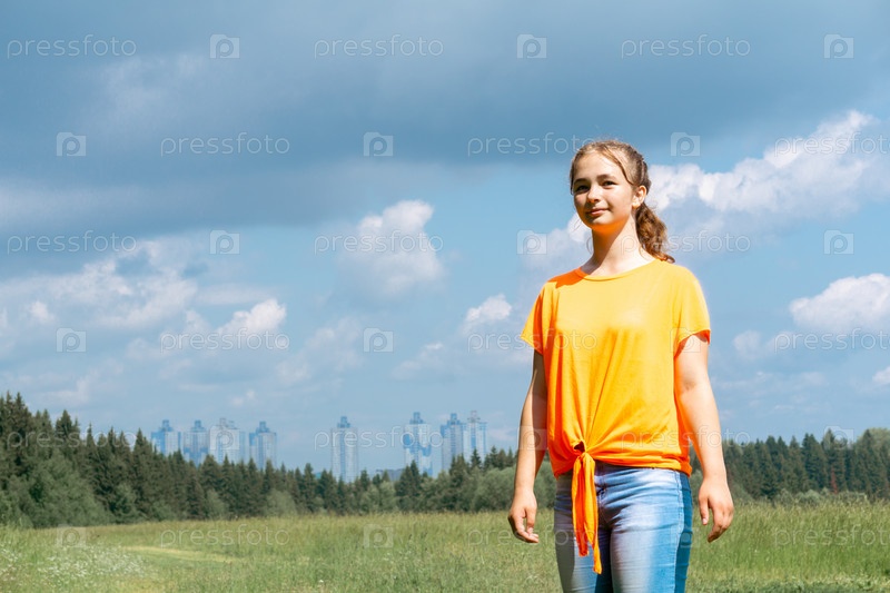 Девушка-подросток в яркой футболке гуляет на природе на фоне далекого города