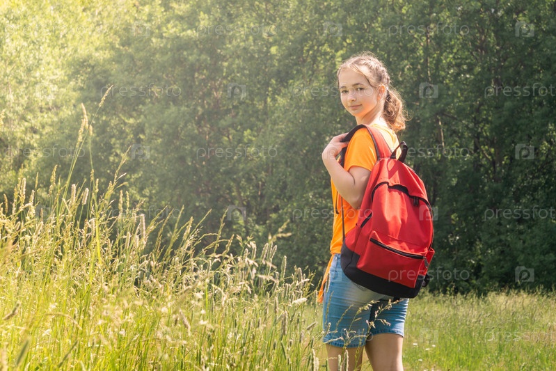 Девушка-подросток с рюкзаком гуляет на природе