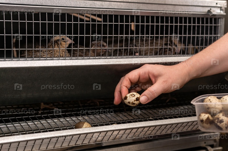 Фермер собирает перепелиные яйца из лотка аккумуляторной клетки