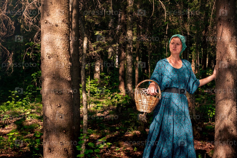 Молодая женщина в народной крестьянской одежде с дикими растениями, ягодами или грибами в хвойном лесу