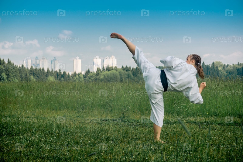 Девочка-подросток тренирует ката каратэ на открытом воздухе, выполняет уро маваси гери (удар крюком)