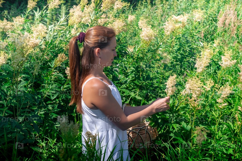 Молодая женщина-травник собирает в корзину соцветия таволги