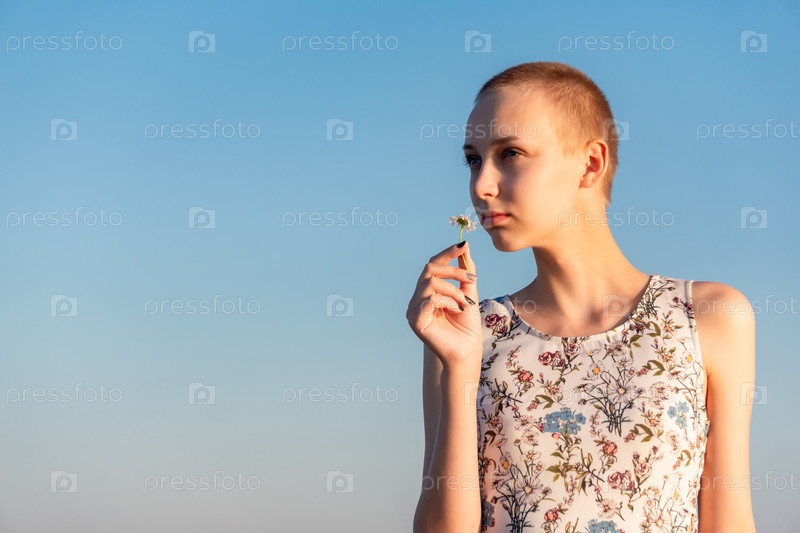 Портрет девочки-подростка с короткой стрижкой в платье, держащей в руке ромашку на фоне неба
