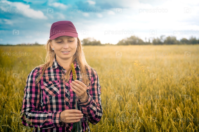 Женщина-фермер с колосьями пшеницы в поле
