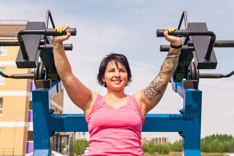 Молодая женщина трясет трицепсами, используя уличный тренажер для жима груди