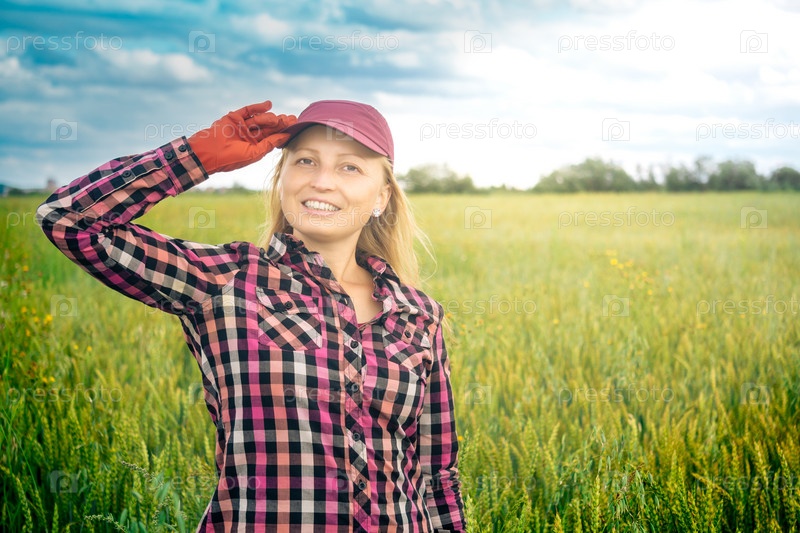 Улыбающаяся сельскохозяйственная работница на фоне поля