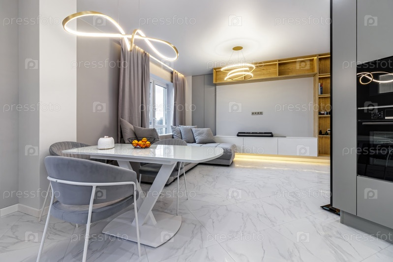 Стильное скандинавское открытое пространство с кухонными принадлежностями и диваном. Дизайн комнаты с белыми стенами