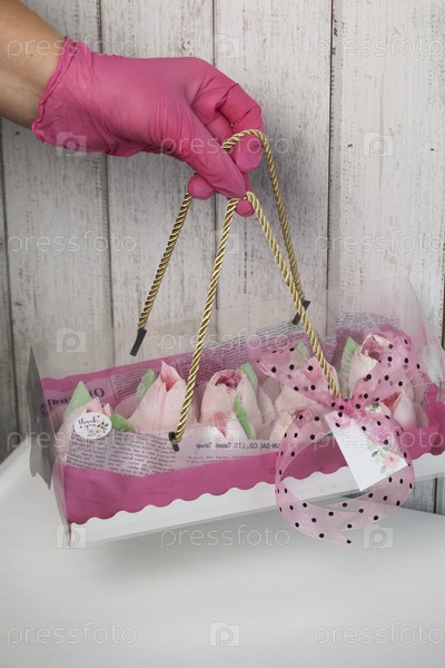 Женщина держит коробку с зефиром. Домашний зефир. Зефирные цветы. Подарочная коробка с розовыми тюльпанами. Тюльпаны из зефира