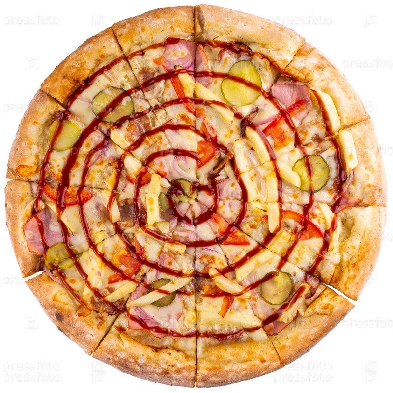 Вид сверху на итальянскую пиццу с картофелем фри, беконом и маринованными огурцами, изолированными на белом фоне