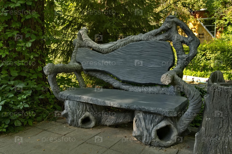 Россия. Новосибирский зоопарк имени Ростислава Шилова. Креативная лавочка из резного деревянного бруса для отдыха посетителей зоопарка