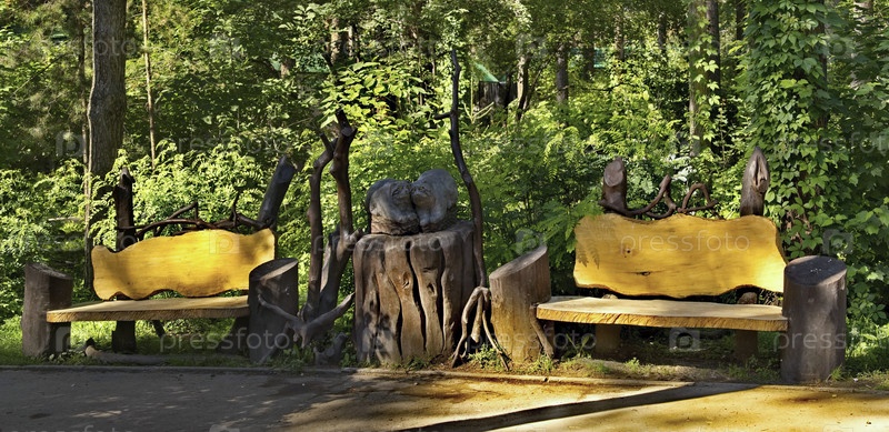 Россия. Новосибирский зоопарк имени Ростислава Шилова. Креативная лавочка из резного деревянного бруса для отдыха посетителей зоопарка