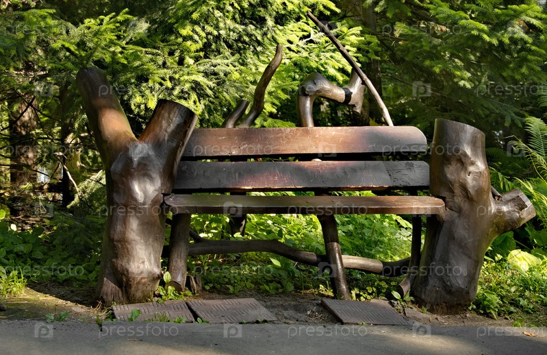 Россия. Новосибирский зоопарк имени Ростислава Шилова. Креативная лавочка из резного деревянного бруса для отдыха посетителей зоопарка