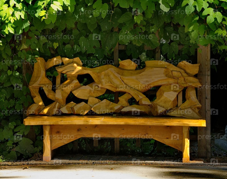Россия. Новосибирский зоопарк имени Ростислава Шилова. Креативная лавочка из резного деревянного бруса для отдыха посетителей зоопарка